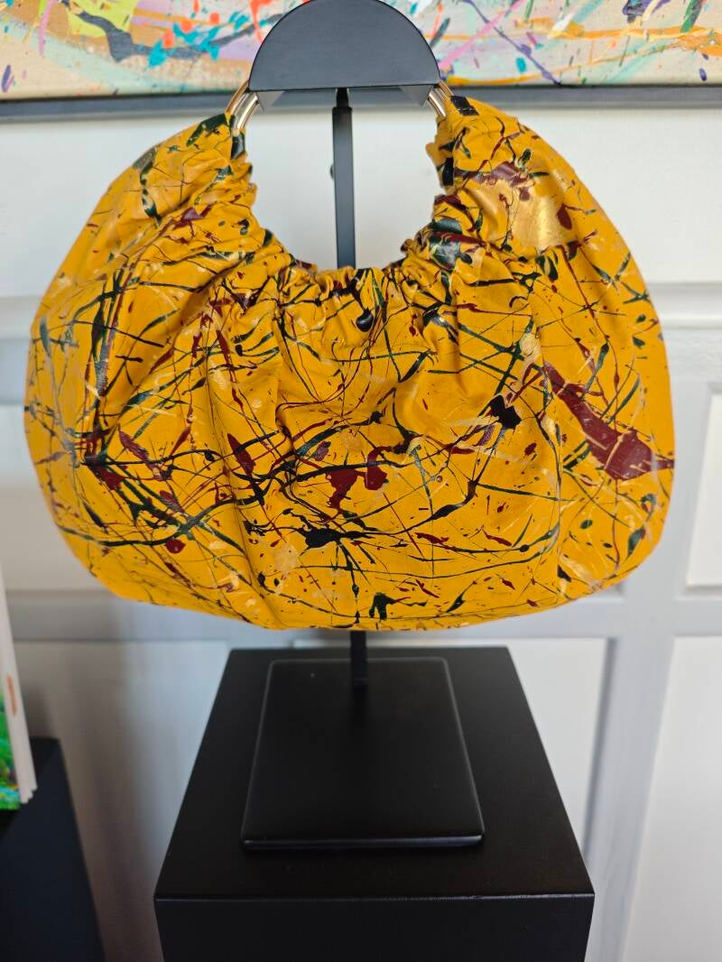 Deze exclusieve handtassen zijn meer dan accessoires – ze zijn draagbare kunstwerken. Elk exemplaar is met de hand vervaardigd en beschilderd in een expressieve stijl die doet denken aan abstracte action painting, met levendige spatten van kleur op kwalitatieve stoffen.